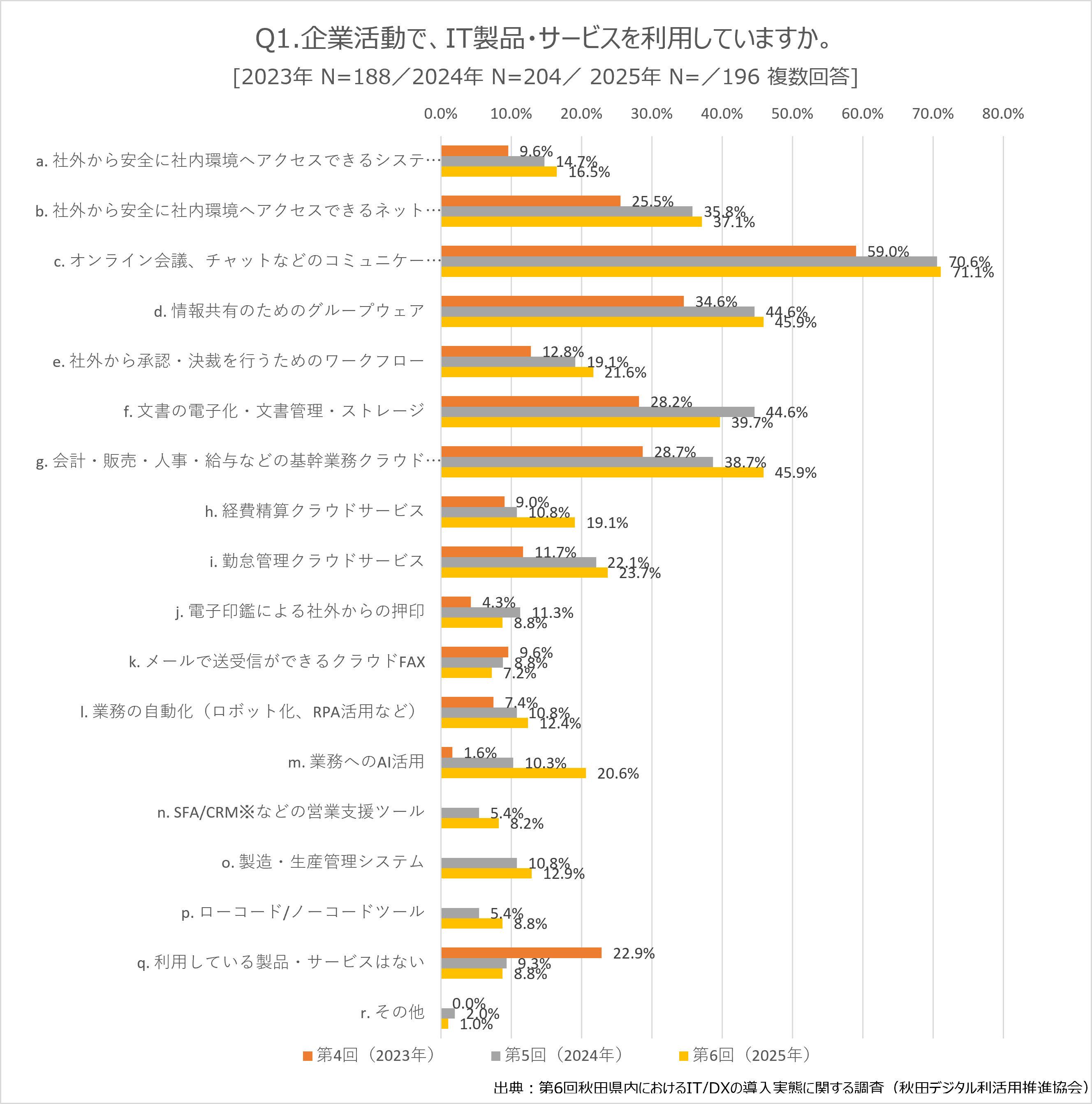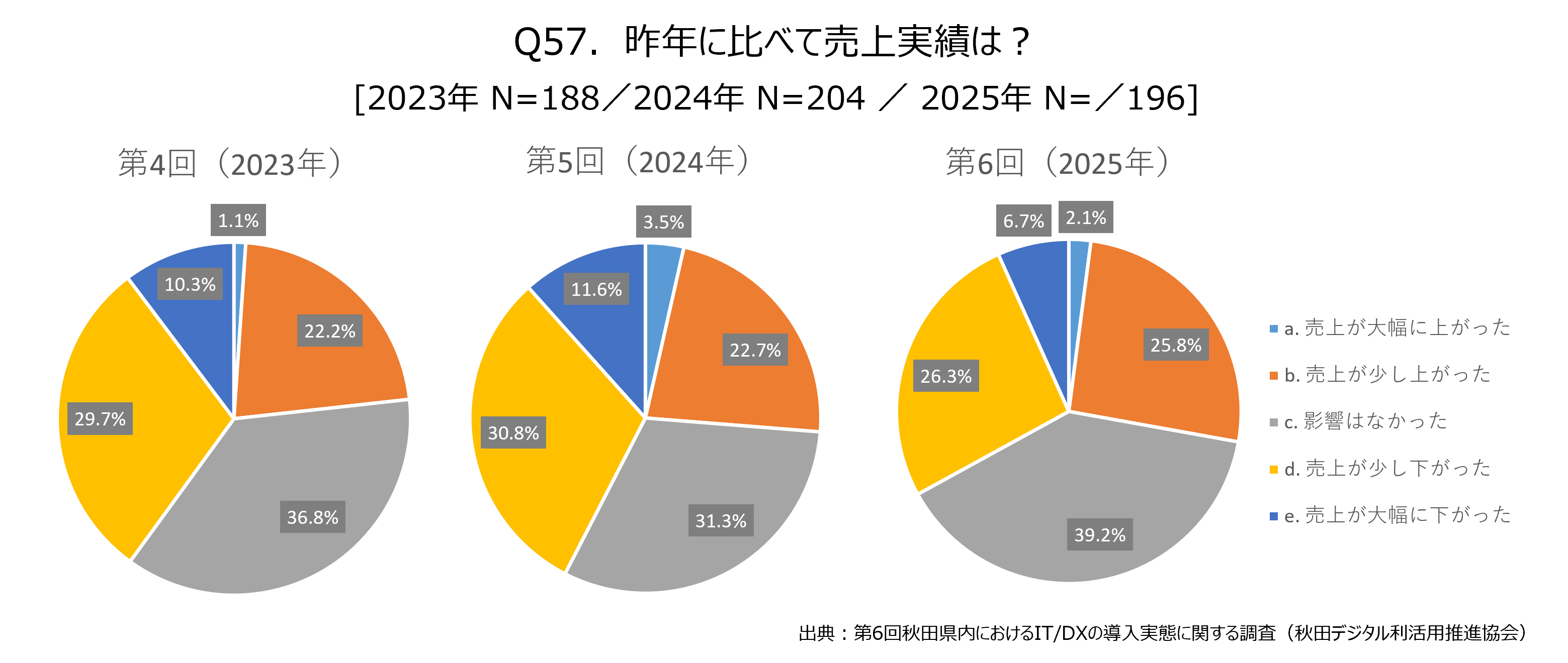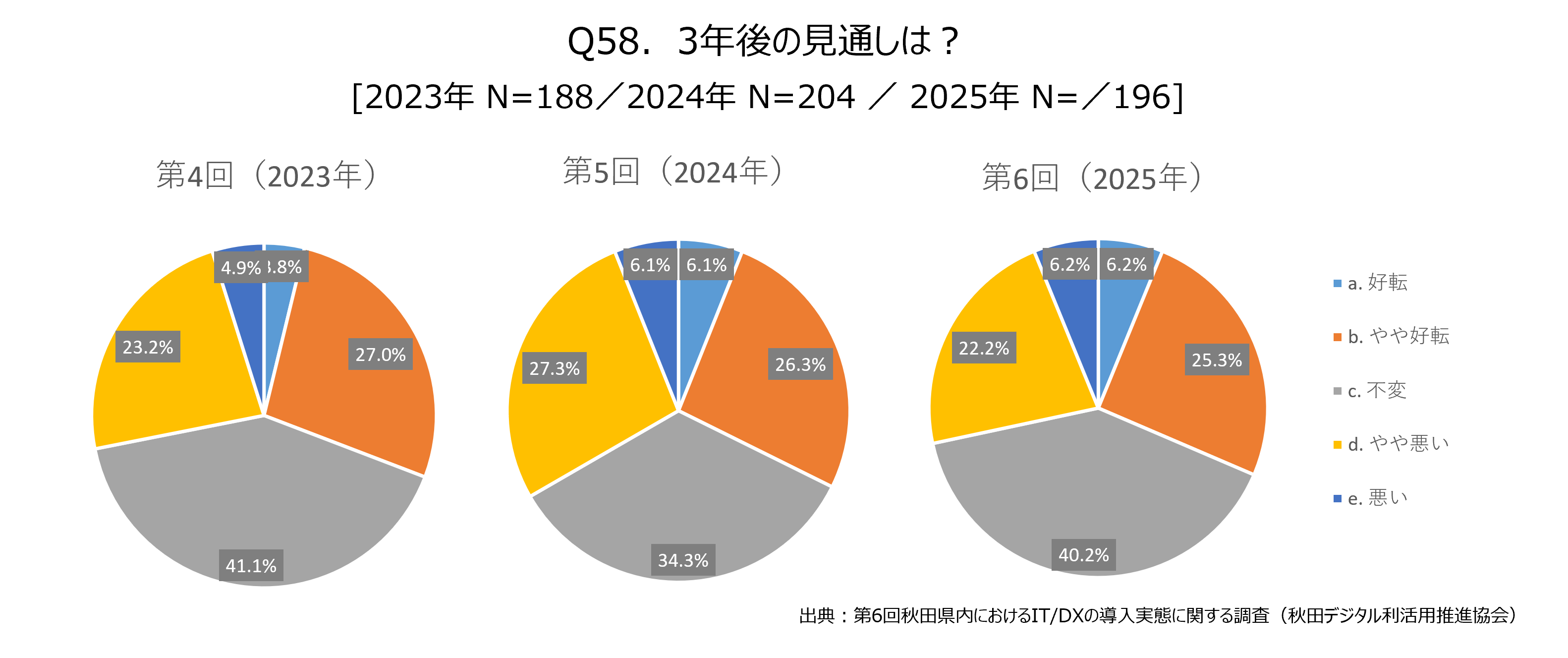 県内企業の景況感は6月に実施した一般社団法人秋田デジタル利活用推進協会の県内調査結果の総括だ。「横ばいながらも前進の兆し」。クラウドや生成AIの活用が急速に進み、DXの導入率も半数を超えた。だがその一方で、人材確保や定着への課題も浮き彫りになっている。今回は、調査結果をもとに、秋田のDXを「成果へと結びつける」ための次の一手を3人で語り合った。